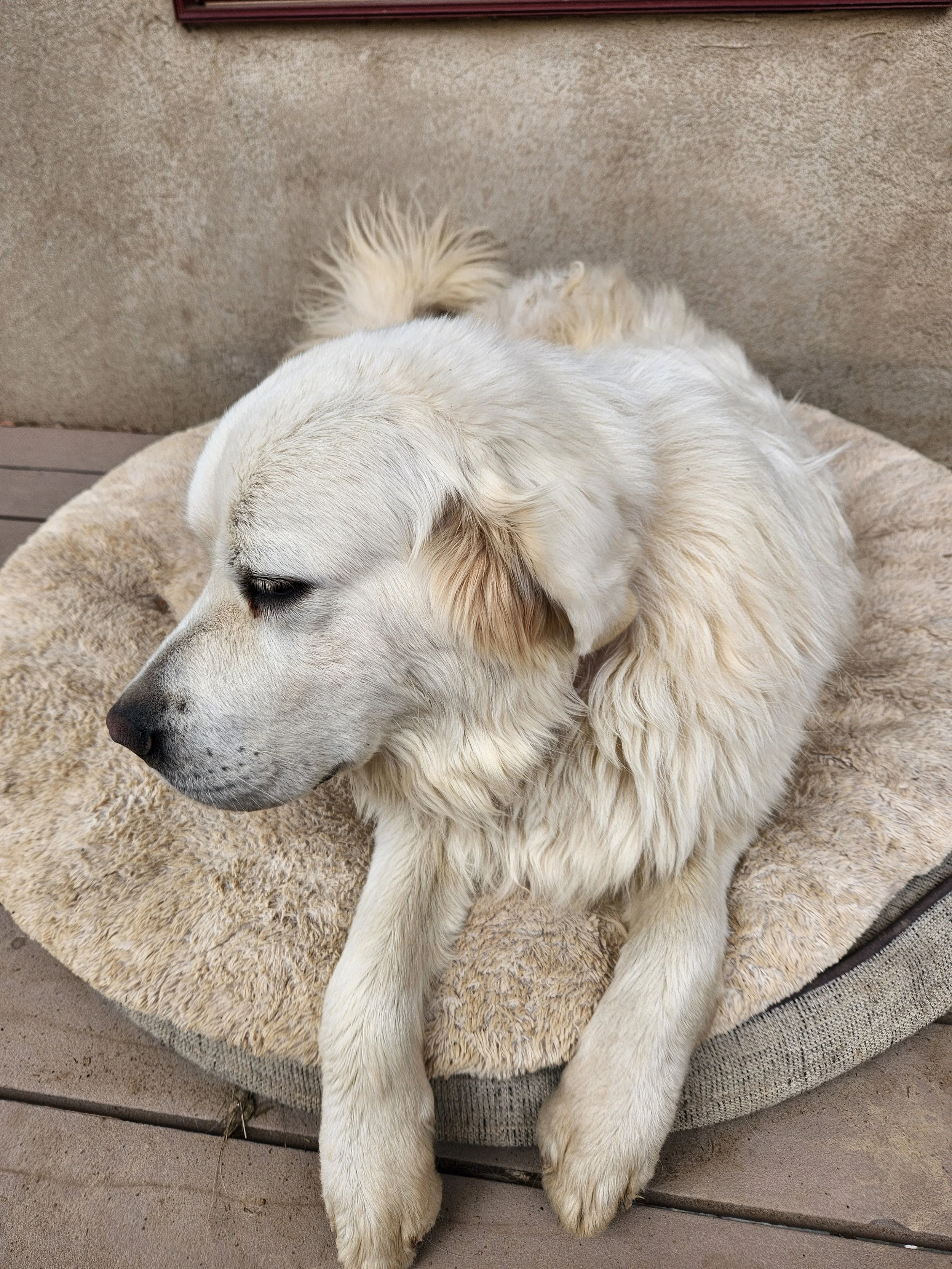 Shakti is our 3 year old Livestock Guardian Dog. She received training from Lonnie’s Maremma, Shiva, before we lost him to cancer far too soon. Shakti supervises the two younger dogs, Loki (2) and Thor (1). Shakti was born at Apple Valley Tatras near Sheridan, WY. She is talented at protecting the livestock, and herding pronghorn herds who come into the paddock. Milky kibbles are her favorite, followed by cheesy kibbles. She accepts duck jerky as a treat.